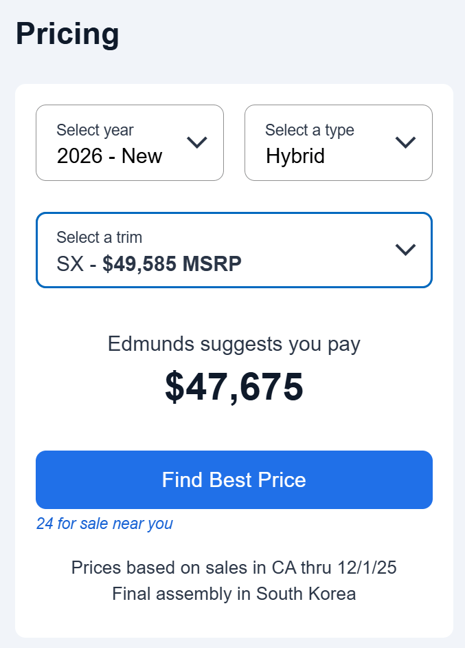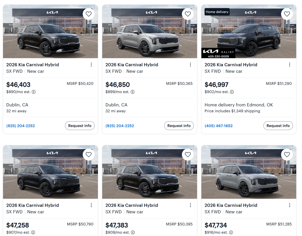 I had been watching Cargurus for a while and noticed that one dealer almost always had the best Carnival price in the area, like a doorbusters type of price. On the day I started my outreach, I saw they were selling a 2026 Hybrid SX for around $46.9K.