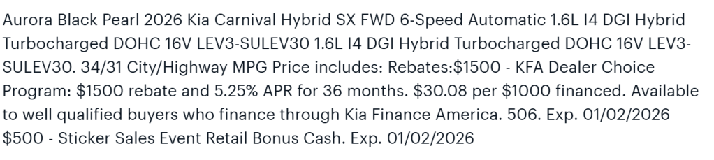 I was not in a rush to buy but suspected that the best deals would be in December rather than in Q1 2026 – I thought that with December marking the end of the year, dealers might be more open to selling at discount, even though minivans in general are a popular, low discount car type. When I saw that Kia offered strong financing (2.9% for 5 years / 60 months) in November and then December, I was confident the time to buy was now.