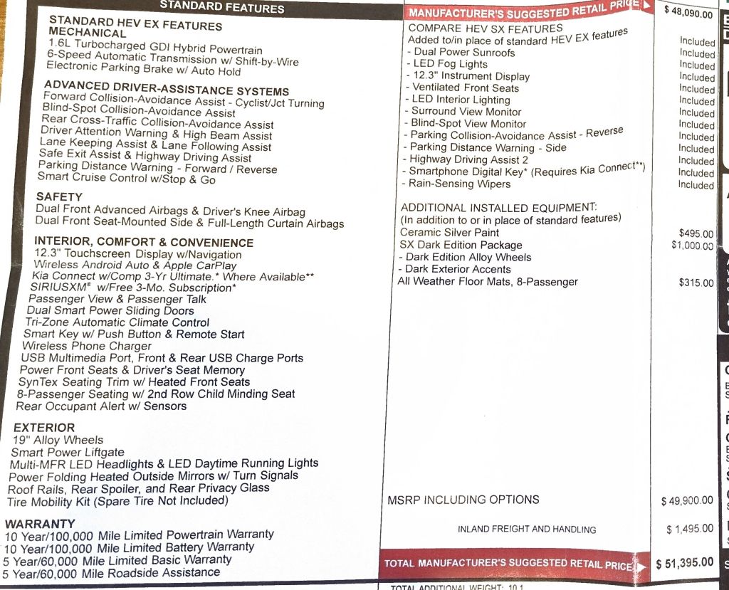 For me, I knew I wanted a Hybrid SX with 8 seats (not 7) and I didn’t need any options. I definitely did not want the Entertainment Screens in the rear rows – I would not have taken them for free. I was not particularly interested in the highest level trim, the SX Prestige, but I was open to it if there was an 8 seat model for a screaming deal – meaning if the dealer could offer a better value price on the SX Prestige than the SX, I would be open.